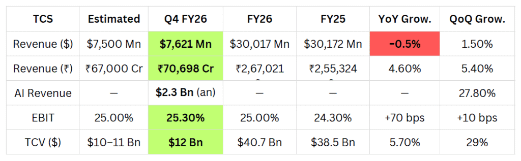 TCS delivered what can best be described as a stable but uninspiring quarter. Revenues remained largely flat on a year-on-year basis, and while margins saw a slight improvement, the overall growth momentum was missing. The interesting part, however, lies beneath the surface. The company reported AI-led revenues scaling to around $2.3 billion annualized, which signals that