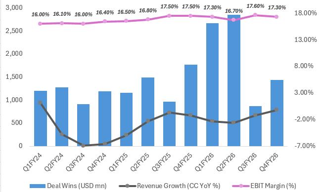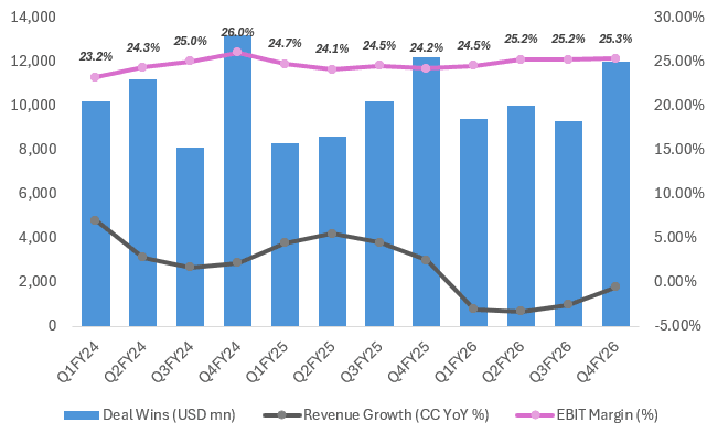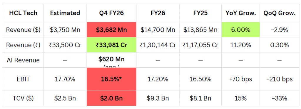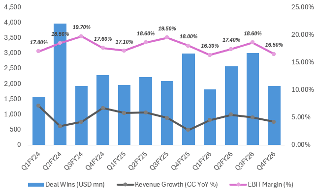HCL Tech’s performance highlights the cracks more clearly. While the company managed to deliver modest annual growth, the quarterly performance showed weakness, particularly in deal inflows. Telecom-led demand softness and continued delays in discretionary spending impacted overall momentum.
