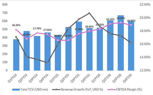 In the near term, the outlook remains subdued. Discretionary spending is still delayed, BFSI continues to be soft, and companies are guiding for low single-digit growth. Margins are expected to remain stable, supported by cost control measures rather than strong revenue expansion.